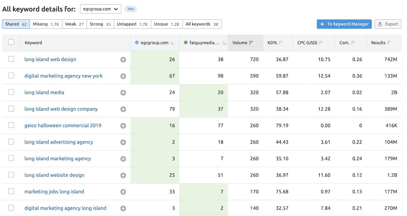 גם פה מומלץ להשתמש בכלים ייעודיים, כגון Semrush לדוגמה – שמספק מחקר פערים מעולה. מקלידים את URL עמוד הבית שלכם ושל עוד 4-5 מתחרים, והכלי מספק לכם דוח מקיף של מאות ואלפי ביטויים שנמצאים אצל מתחרים, אבל לא אצלכם (או סינון אחר לבחירתכם).