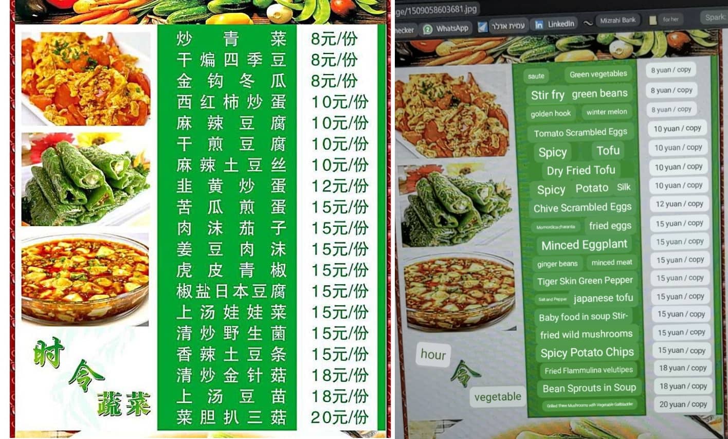 הנה דוגמה לתפריט בסינית שמצאנו בגוגל (צד שמאל), צילמנו באמצעות גוגל לנס וביקשנו תרגום (צד ימין).