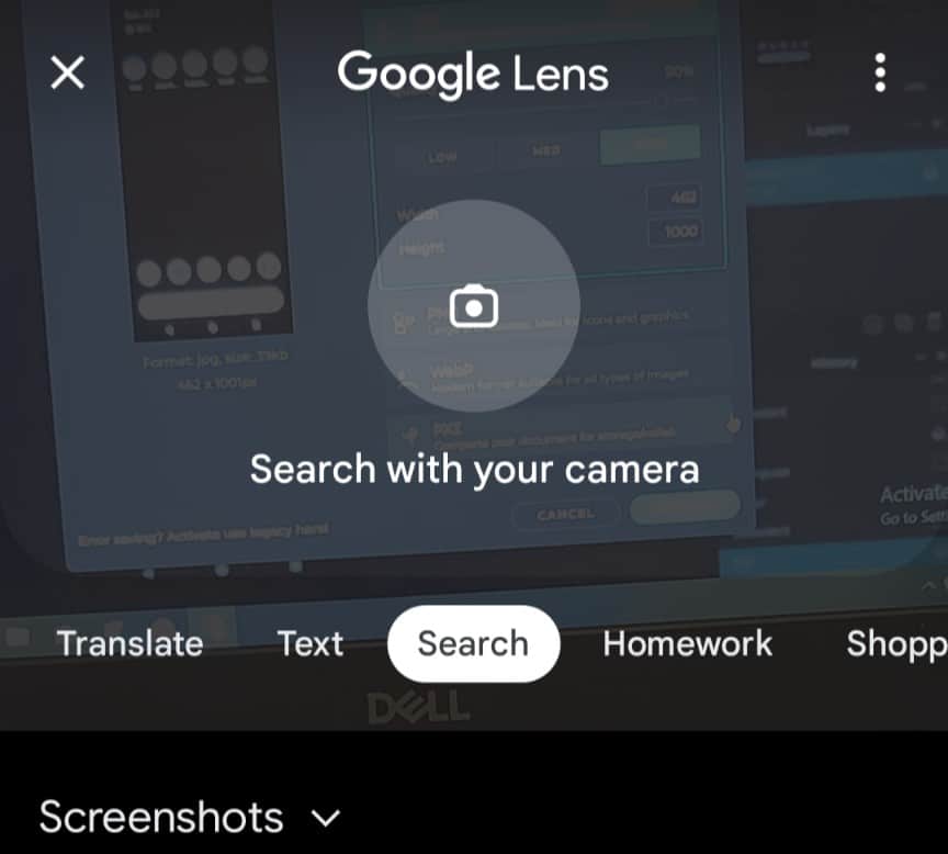 כמו כן בתפריט התחתון ניתן לבחור האם מדובר בטקסט, תרגום, עזרה בשיעורי בית, קניות, איתור מקומות ועוד. בנוסף ניתן לבדוק גם תמונות שכבר נמצאות במכשיר שלנו באמצעות קליק על התמונה הנבחרת תחת Screenshots.