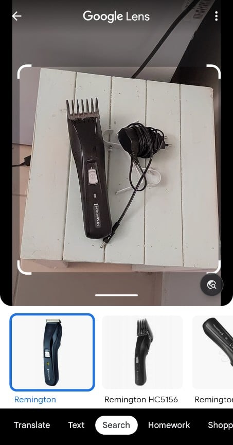 הנה דוגמה לצילום של מכונת תספורת באמצעות גוגל לנס. האפליקציה מזהה מיד שמדובר במכשיר מסוג רמינגטון (לפי הלוגו הטקסטואלי על גבי המכשיר עצמו), ובעקבות כך מציעה לנו עוד דגמים וכן אפשרויות קנייה אונליין.
