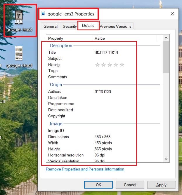 - שימוש בפורמט EXIF – אלו הם תגי המטא של תמונות, שנוצרים אוטומטית בכל צילום: מיקום גיאוגרפי, תאריך צילום, גודל, רזולוציה, סוג מצלמה ועוד. אם מקליקים עכבר ימין על תמונה במחשב, ניתן לערוך את המידע הקיים ולהוסיף לו עוד נתונים כגון תיאור, מחבר ועוד. בסיום יש להקליק על apply ואז ok אחרת המידע לא יישמר.