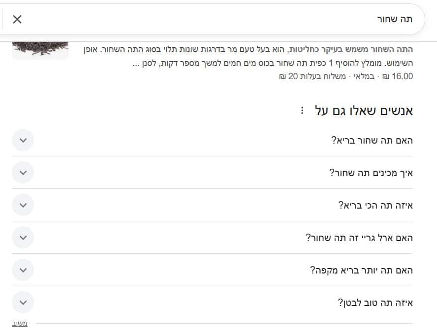 נגיד שאתם רוצים לכתוב על תה שחור באתר, אך עדיין לא בטוחים אילו נושאים כדאי לשלב בתוכן. אם נחזור לדוגמה הקודמת של חיפוש תה שחור, נוכל לראות אילו שאלות צפות בתיבות ה-PAA ולקבל רעיונות: