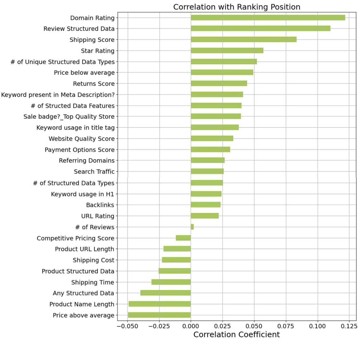 דירוג הדומיין (Domain Rating) הוא בעל המתאם הגבוה ביותר עם ביצועי גוגל שופינג אורגני. לאתרים במקום 1 היה דירוג דומיין ממוצע של 81, בעוד שאתרים במקום 20 קיבלו דירוג דומיין ממוצע של 71.