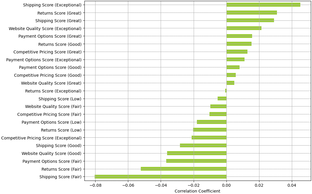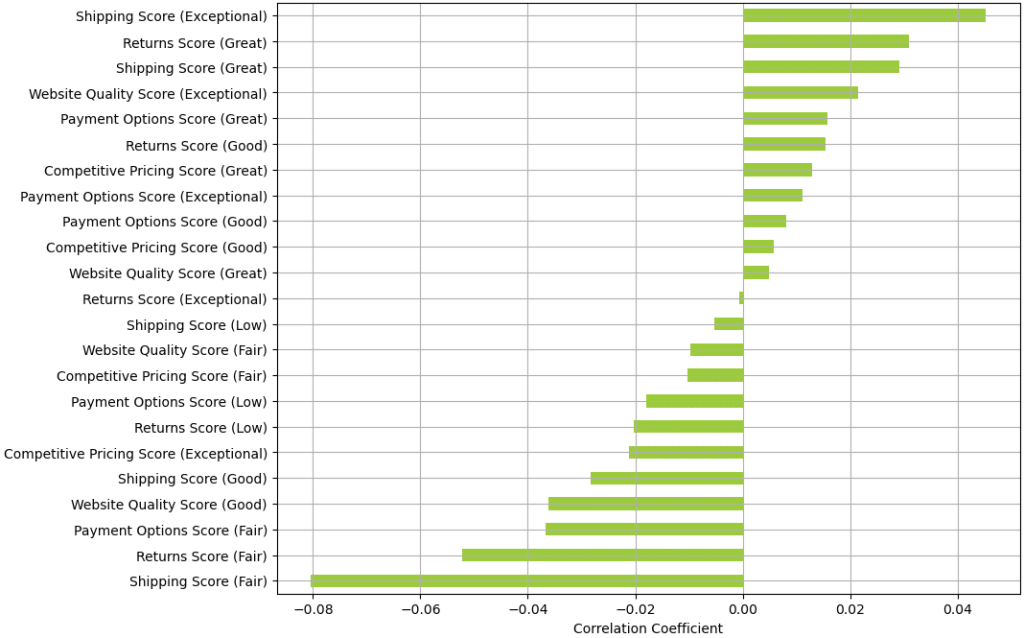חנויות עם ציוני משלוח "יוצאי דופן" עלו משמעותית בביצועים על אלו שלא, עם ריכוז גבוה במיוחד במקומות הראשונים. חנויות עם ציוני משלוח "הוגנים" בלבד, היו בעלי המתאם השלילי הגבוה ביותר. זה היה מובהק יותר עבור חנויות במקומות 10 עד 15, שרק לעתים נדירות קיבלו ציון "הוגן" עבור משלוח.