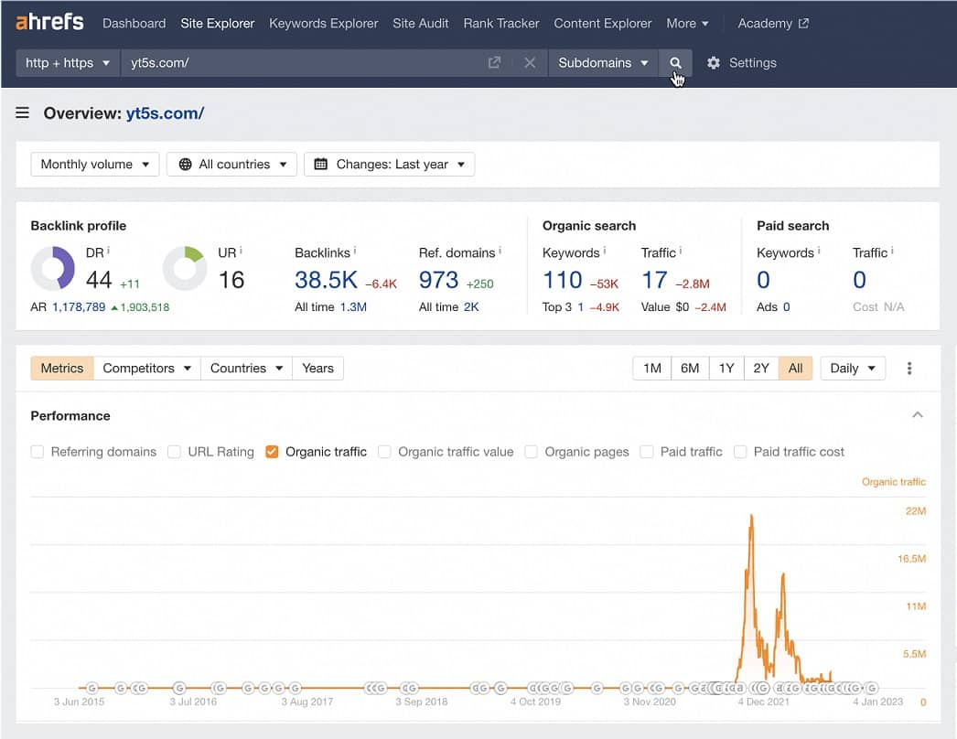 אתר yt5s.com מאפשר להוריד סרטוני יוטיוב כקובץ. מכיוון שזה כלי מאוד מבוקש ונפוץ בימינו, באוקטובר 2021 האתר הגיע לשיא של מעל 20 מיליון כניסות אורגניות. כמו כן הוא התברג ביותר מ-22,800 מילות מפתח, וכל זאת עם פחות מ-200 עמודים, רובם באנגלית וחלקם ב-20 שפות נוספות.