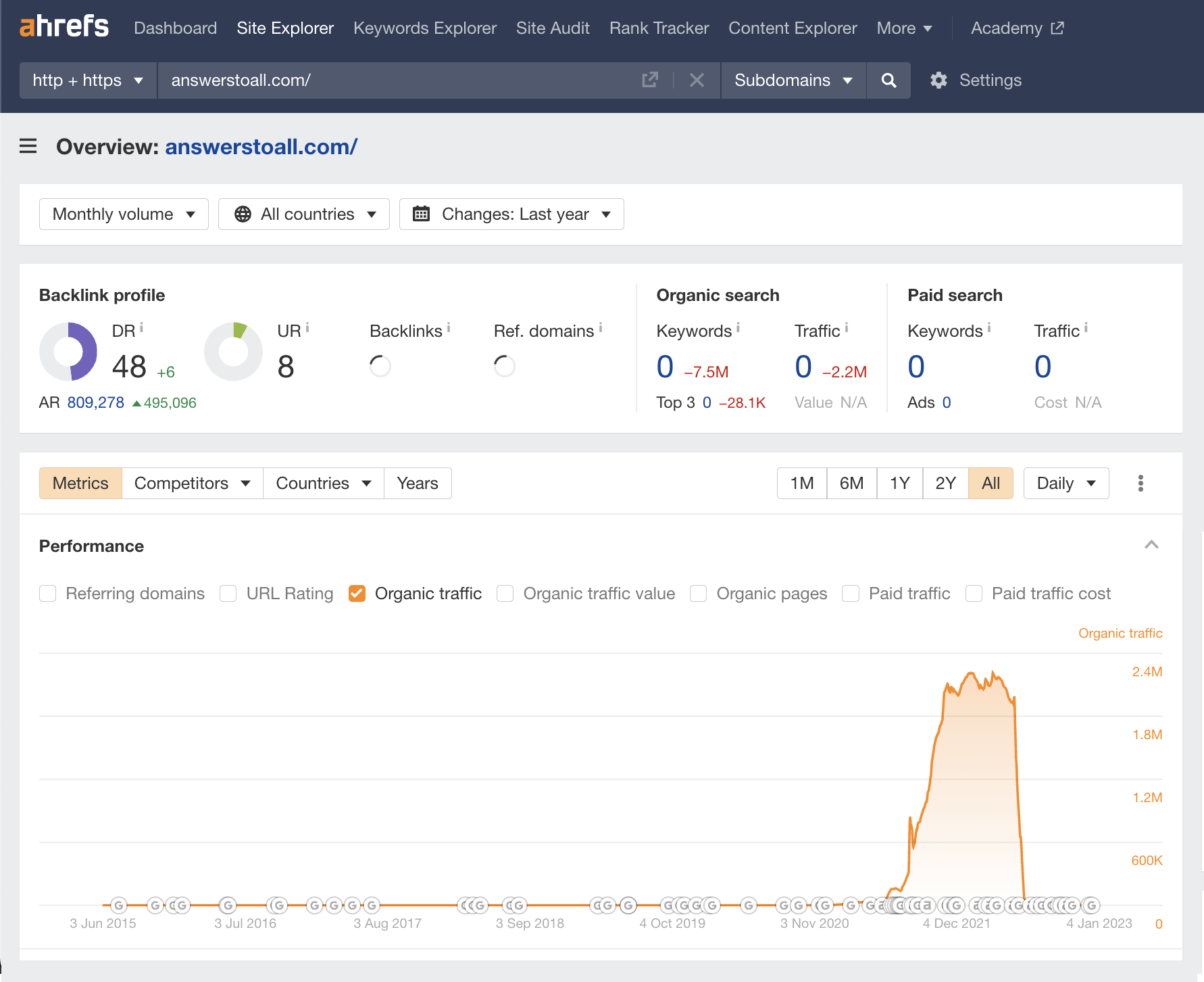 בדיקה של כמות הדומיינים המפנים מראה עלייה חריגה בדצמבר 2021, ויחד איתה עלייה גם בטראפיק האורגני. זמן קצר לאחר מכן, אל תוך ינואר 2022 – כבר יש ירידה במספר הדומיינים ויחד איתה צניחה תלולה של טראפיק אורגני. צניחה זו מתרחשת במהלך עדכון סקירות המוצרים בגוגל במרץ 2022, אז יתכן קשר בין 2 הסיטואציות. בדצמבר נתקעו המסמרים האחרונים בארון, במקביל לעדכון התוכן המועיל ועדכון הספאם.