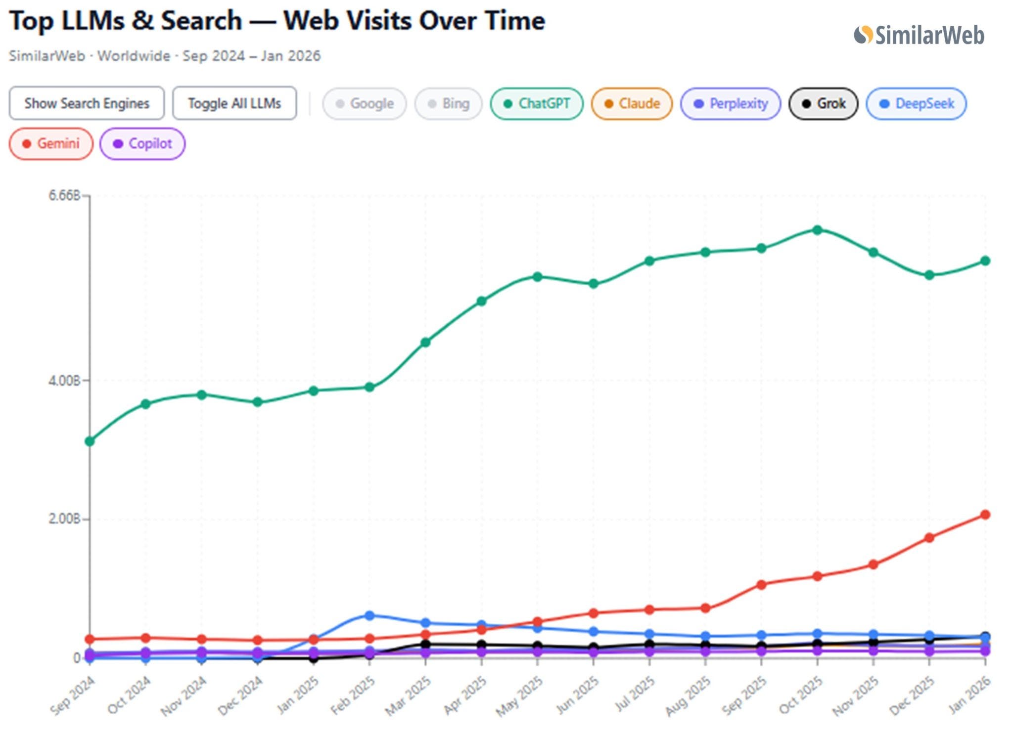נתונים של סימילאר ווב מעידים על צמיחה עולמית בשימוש ב-LLM לאורך זמן (מחשבים בלבד). הקו האדום הוא ג'מיני של גוגל, שמשיג בהדרגה את השימוש בצ'ט ג'יפיטי. שימו לב ש-AI Overviews לא מופיע בנתונים, למרות שהוא ככל הנראה עובר בהרבה כל מוצר AI אחר בפער ניכר מבחינת אחוזי שימוש.