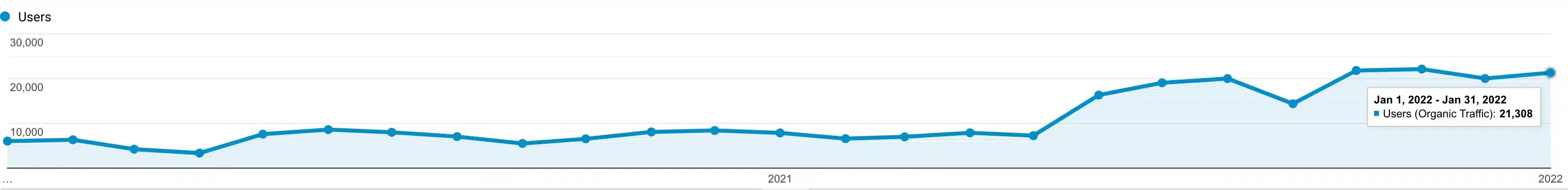 לאחר כשנה של עבודה קשה, האתר יצא מענישה היישר אל המקומות הראשונים בביטויים המובילים. ממצב של כ-5500-6500 מבקרים אורגניים מדי חודש, למעל מ-21,000 מבקרים. עלייה מטאורית של מעל 300% הודות לסידור הפרמטרים החשובים ביותר אשר הובילו להוצאת האתר מעונש ועבודת SEO נחושה ומקצועית. האתר ממשיך לעלות במיקומים ולגרוף עוד ועוד גולשים חדשים אשר הופכים ללקוחות ועוזרים לעסק לפרוח.
