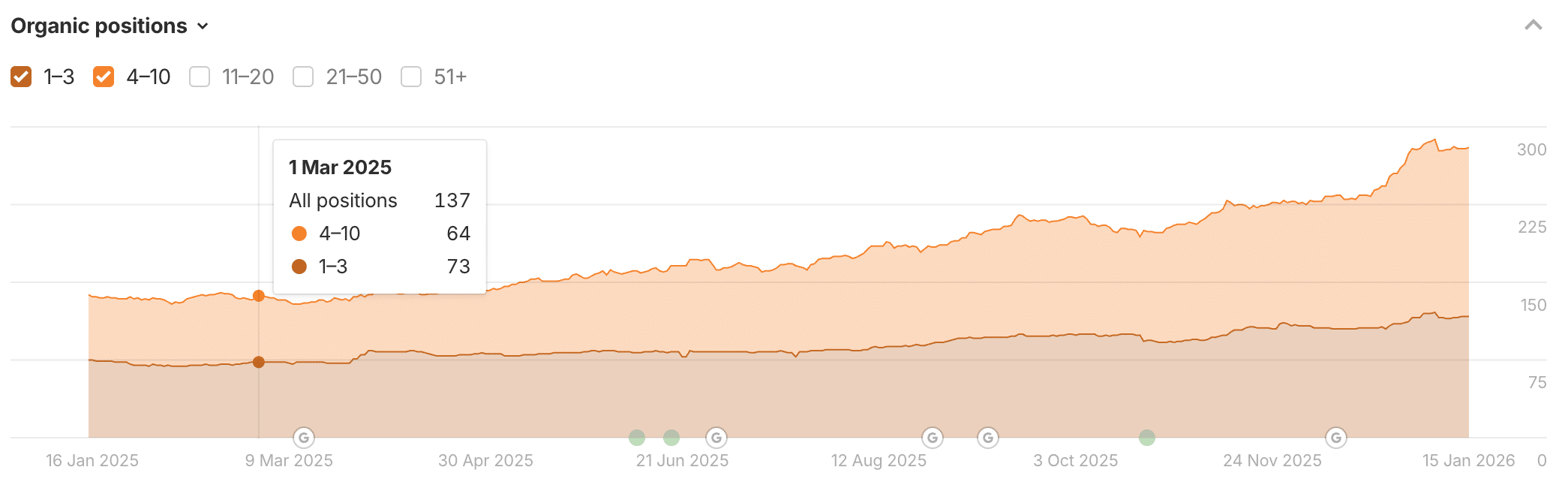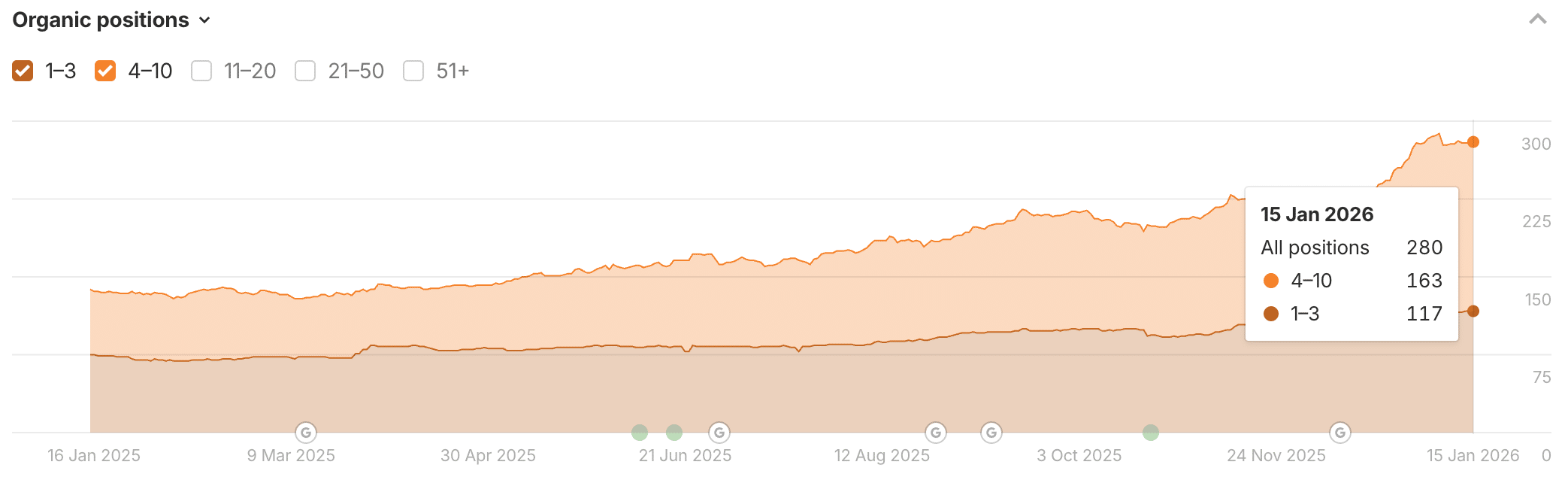 לאחר 10 חודשי עבודה בלבד, האתר ממוקם כעת על 280 מילות מפתח שונות בעמוד הראשון, 117 מהן בטופ 3, ועוד 163 ביטויים בתוצאות 4-10. אם נדבר באחוזים, כמות מילות המפתח בשלוש התוצאות הראשונות בגוגל עלתה בכ-60%, וכמות מילות המפתח בעמוד הראשון עלתה בכ-104%. בתקופה של פחות משנה.