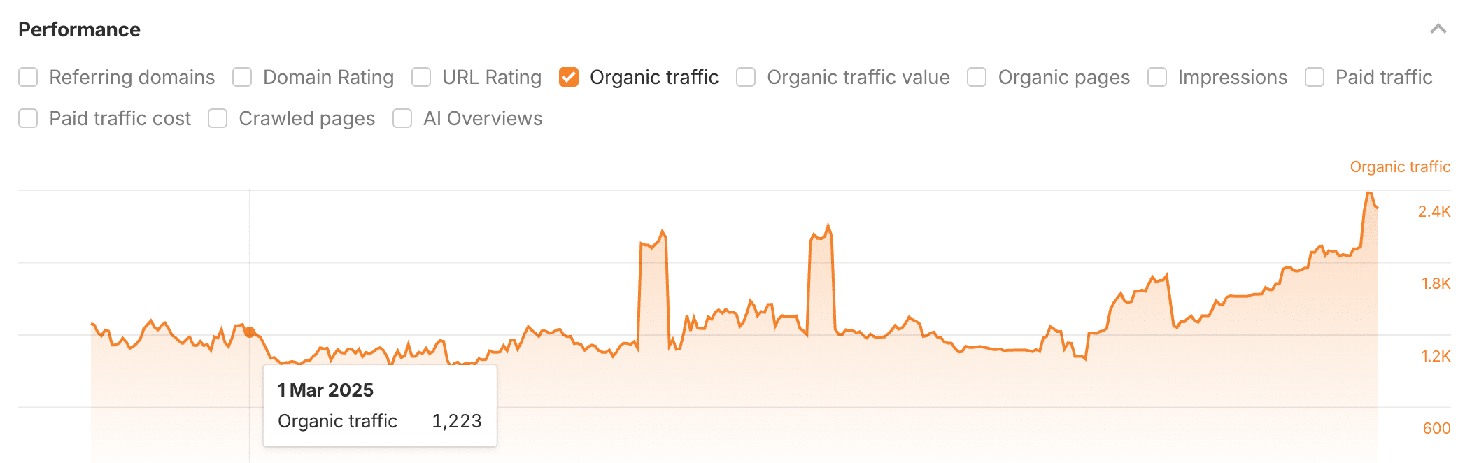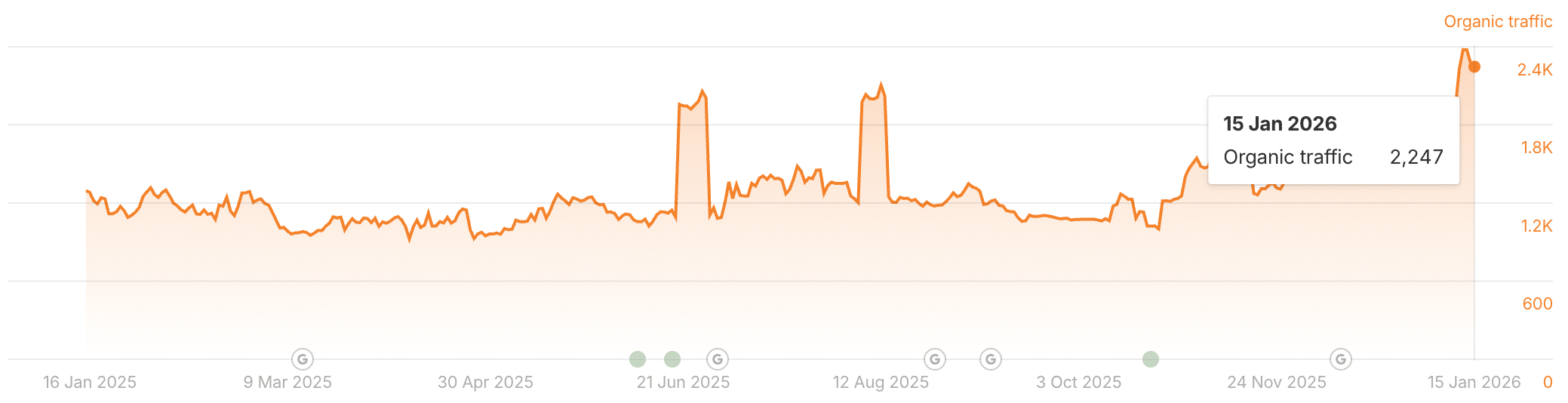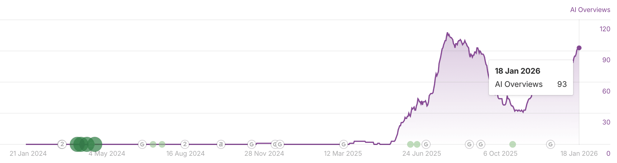 הגדלת הנראות באה לידי ביטוי גם בתוצאות הרגילות, אך גם ב-AI Overview של גוגל. בתחילת הדרך, האתר לא היה מוצג כלל ב-AI Overview (אם כי חשוב לדייק שהפיצ׳ר עצמו נכנס לישראל לקראת סוף מאי 25). אפשר לראות את השיפור בכמות ההופעות ב-AI Overview לאורך הדרך, כאשר כיום האתר מופיע בלפחות ב-93 שאילתות שונות בתוצאות ה-AI Overview.