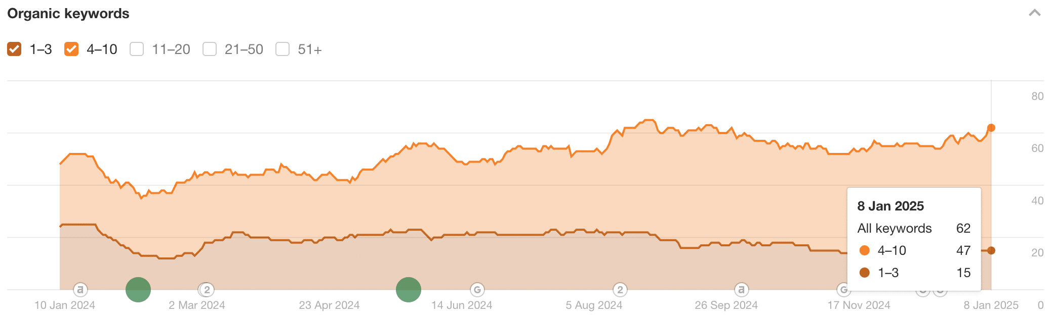 מספר מילות המפתח בעמוד הראשון עלה בתקופה זו מ-37 ל-62 (שיפור של 67.5%). הלקוח נמצא במקומות הראשונים כמעט בכל ביטוי שהוגדר, כאשר חלקם כלל לא היו ב-50 התוצאות הראשונות עשרה חודשים קודם לכן.