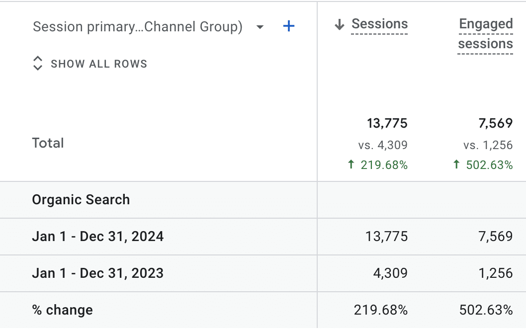 קידום אורגני: לאחר 10 חודשי עבודה ובהשוואה לשנה החולפת, הטראפיק האורגני לאתר עלה מ-4,309 מבקרים במהלך 2023, ל-13,775 במהלך 2024. שיפור של כ-220%!