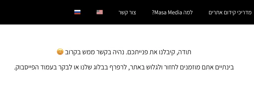 ביצירת קשר בדרך כלל בעיקר נודה ללקוח ונציע לו לבצע פעולות כלשהי בהתאם לאופי העסק. אצלנו למשל, הגולש מקבל אישור על כך שפנייתו נקלטה ויש תיאום ציפיות לגבי מה שהולך לקרות. בינתיים אנו מעודדים את הגולש לבקר בעמוד הפייסבוק שלנו, לקרוא בבלוג או לחזור חזרה לדף הבית (הטקסט בדף קליקבילי):