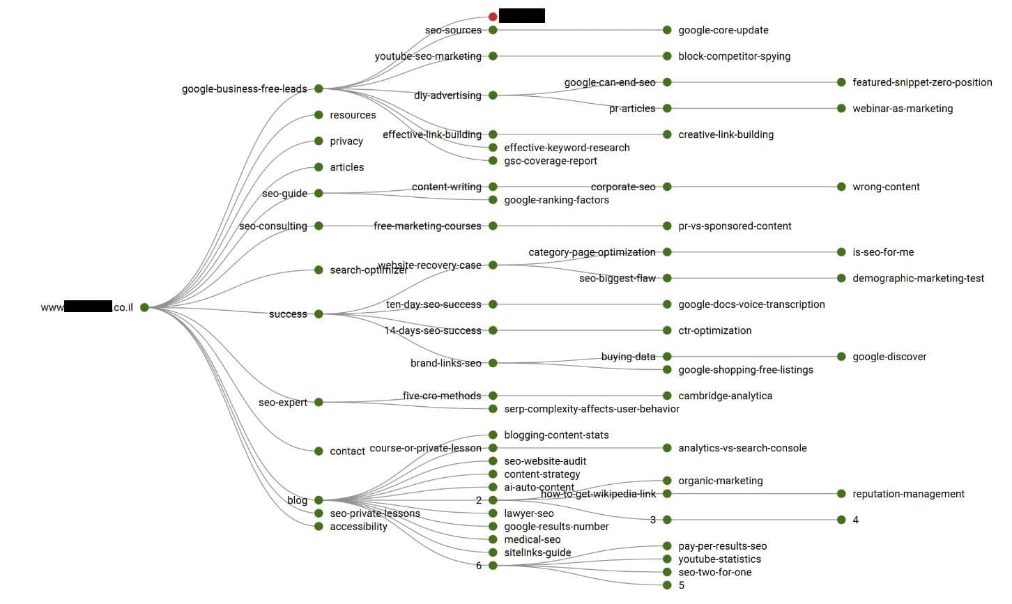 כדי לבדוק מה מצבו של אתר ספציפי, ניתן לסרוק אותו באמצעות כלים חיצוניים כגון Screaming Frog או Site Bulb. לאחר הסריקה נוכל לקבל תרשים עץ של היררכיית האתר הנוכחית: