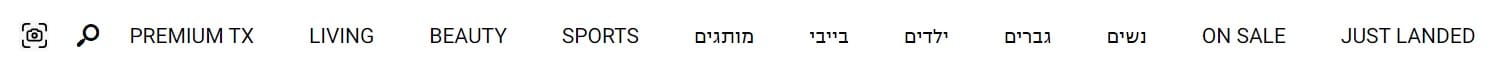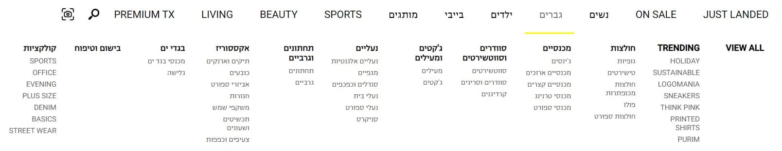 מעבר על כל אחת מהקטגוריות הראשיות, עוד לפני שבכלל צריך להקליק, פותח תפריט משני מכובד מאוד של קטגוריות משנה (לצורך הדוגמה, קטגוריית גברים יחד עם כל קטגוריות המשנה שלה):
